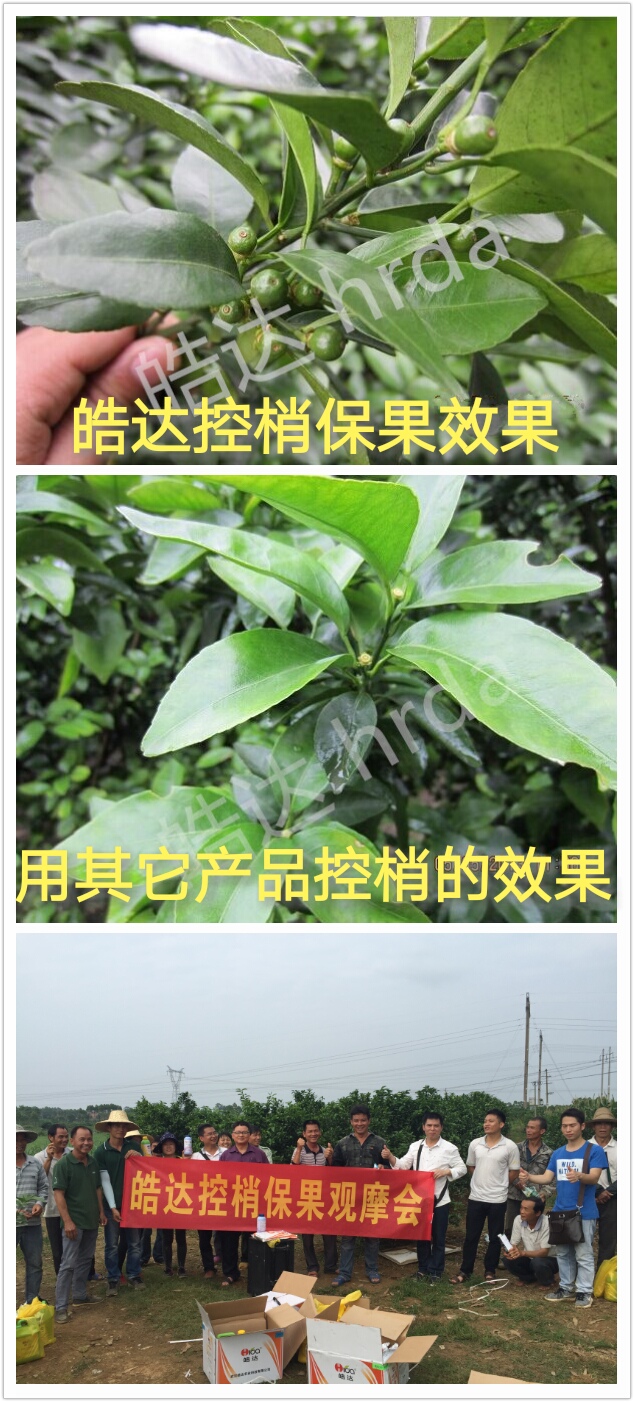 施肥時期:3-5月份保花保果,控旺保果 時期問題:營養不足,生理落花落果嚴重;春梢生長慢,葉片發黃。 施肥方案: 第一次保果(謝花2/3): 皓達功能肥800倍(20mL/30斤水)+皓達硼800倍(20mL/30斤水)+磷酸二氫鉀500倍(30g/30斤水)+調節藥+殺菌殺蟲藥。 第一次控旺保果:(春梢6分老熟,或打完第一次保果藥5天后) 方案1:皓達功能肥200倍(75mL/30斤水)+磷酸二氫鉀500倍(30g/30斤水)(單打)。 方案2:皓達功能肥300倍(50mL/30斤水)+磷酸二氫鉀500倍(30g/30斤水)+烯效唑。(樹弱已見新芽) 第二次控旺保果:(第一次控旺保果藥打完5-7天后) 方案1:皓達功能肥200倍(75mL/30斤水)+磷酸二氫鉀500倍(30g/30斤水)(單打)。 方案2:皓達功能肥300倍(50mL/30斤水)+磷酸二氫鉀500倍(30g/30斤水)+烯效唑。(樹弱已見新芽) 注意:大家可以根據天氣、樹勢來選擇方案,藥后24小時內下雨請補噴,控制營養藥可多次噴施,但不能與農藥一起施用。 施肥效果:促花壯花,減少生理落果。噴完第一次保果5-7天后,開始噴施控旺藥。抑制夏梢早發或不發,延長營養生長時間點,有效減少生理落果。