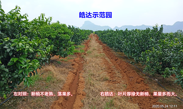 施肥時期:12月份清園養樹 時期問題:越冬病害多;掛果多,樹體弱、根系出問題。 施肥方案: 淋根:皓達功能肥20-50g/株+皓達復合肥0.5% 葉噴:皓達功能肥800倍(20mL/30斤水)+藥(強酸強堿不可混用) 施肥效果:恢復樹勢,促進根系健康生長。