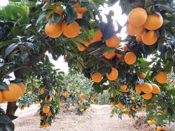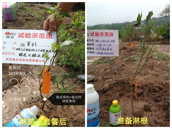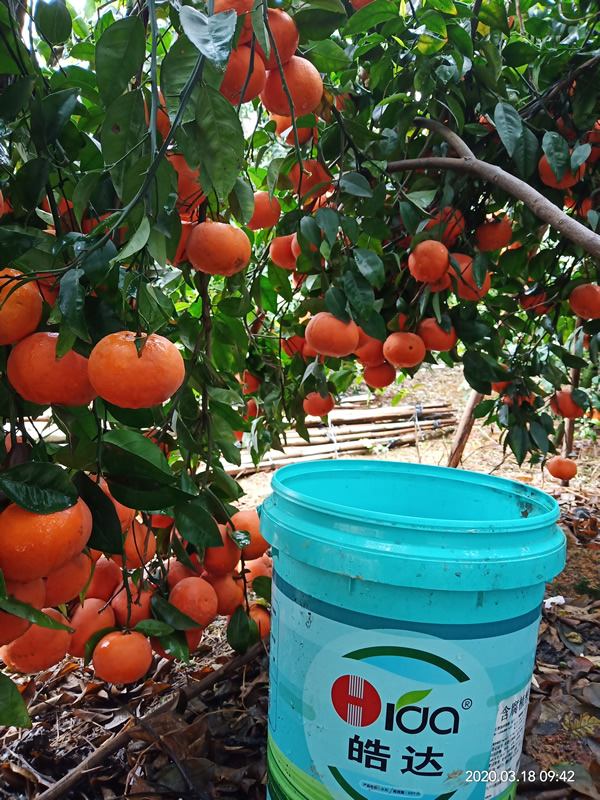 施肥時期:9-11月份增甜著色 時期問題:缺鎂、缺硼、缺鋅等黃葉、花葉;裂果、太陽果、畸型果等問題。果子著色不好,糖份不夠;果皮軟,不耐儲運。 施肥方案: 1、(9月中旬)果徑55~60mm左右,轉色皓達功能肥500倍(30mL/30斤水)+磷酸二氫鉀500倍(30g/30斤水)+蕓苔素(果子偏小,建議打兩次),促進膨果,秋梢老熟快恢復樹勢健康; 2、(10月初)間隔20天,轉色皓達功能肥500倍(30mL/30斤水)+皓達硼1000倍(15mL/30斤水)+磷酸二氫鉀1000倍(15g/30斤水)(樹勢差、黃葉多),積累營養,提前轉色; 3、(10月下旬)果徑70mm左右,轉色皓達功能肥1000倍(15mL/30斤水)+皓達硼1000倍(15mL/30斤水),美化果面、促進轉色; 4、(11月中旬)間隔20天,轉色皓達功能肥1000倍(15mL/30斤水)+皓達鈣500倍(25g/30斤水),增加單果重,增加果實硬度、延長保鮮時間。 施肥效果:增加有機物積累,轉化為糖,提高Vc含量,促進膨大;增加果皮韌性,上色均勻,果面光滑,糖度高防治爛果、裂果,提高品質;增強果實甜度,果皮柔韌度,耐儲運。