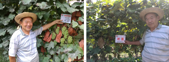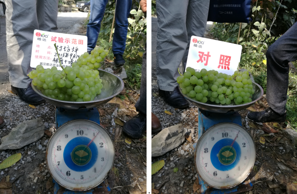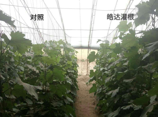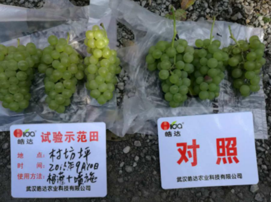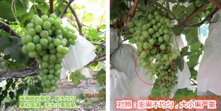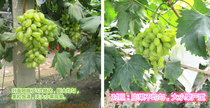 施肥時期:6-8月 膨大期 時期問題: 葡萄出現大小粒現象;缺乏營養,葉片黃化。 施肥方案:葉噴+淋根(每壺30斤水) 滴灌:皓達功能肥1-1.5kg/畝+皓達鈣1.5kg/畝,每15-20天淋1次; 葉噴:皓達功能肥800倍(20mL/30斤水)+調節劑,間隔7-10噴1次,連續2-3次效果更好。 施肥效果: 果粒膨大快,大小均勻,提早著色,顯著提高糖度。