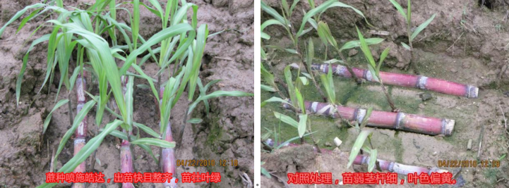 施肥時期:播種前 施肥方案: 浸種: 皓達功能肥每200mL兌水200-300公斤。一般浸種12-24小時。 施肥效果:增強種苗吸水能力、促進發芽,也可殺滅種苗上的部分病蟲害,能縮短種苗萌發出土的時間、提高萌芽率。浸種可以預防低溫、防止爛根,使果蔗種出苗整齊、健壯。
