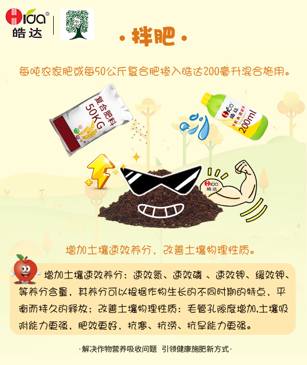 首先是“一肥”:由于常年的不科學(xué)種植,施肥過量或爛施肥、藥液施用過量,對土壤的破壞非常大。我們可以選擇用皓達(dá)功能肥拌肥,用皓達(dá)功能肥原液1斤與200斤玉米底肥一起混拌均勻后再施用,可以快速增加速效養(yǎng)分的形成,提高肥料利用率;增加有益菌群的繁衍,減少有害菌群破壞,提高玉米的抗逆性;改良土壤,增加土壤毛管空隙度,提高土壤保水保肥能力。