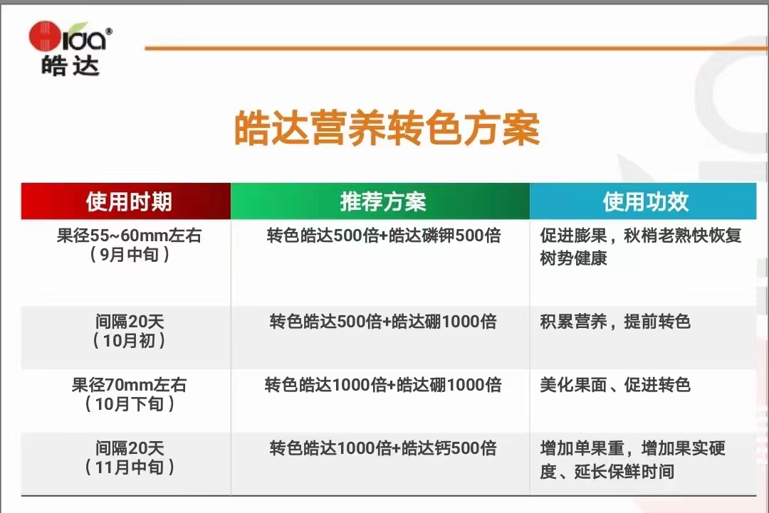 從9月中旬到11月中旬這段時(shí)間是柑橘果實(shí)膨大著色的重要時(shí)期。我們推薦使用皓達(dá)轉(zhuǎn)色產(chǎn)品!