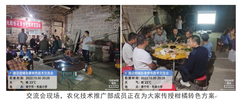2022年10月30日,武漢皓達(dá)農(nóng)業(yè)科技有限公司農(nóng)化技術(shù)推廣部技術(shù)團(tuán)隊(duì)來(lái)到了廣西武鳴,這里的沃柑極其出名,“武鳴沃柑”更是南寧市第七件地理標(biāo)志商標(biāo),武鳴縣也是全國(guó)沃柑種植最大的縣區(qū)。在這里,皓達(dá)的產(chǎn)品被廣大柑橘種植戶使用和推廣,“轉(zhuǎn)色皓達(dá)應(yīng)用技術(shù)交流會(huì)”等交流會(huì)更是一場(chǎng)開(kāi)了一場(chǎng),我們積極參與同種植戶探討柑橘管理技術(shù)以及柑橘著色方案,讓廣大朋友們都能見(jiàn)到種出來(lái)的最靚、品質(zhì)最好的柑橘。