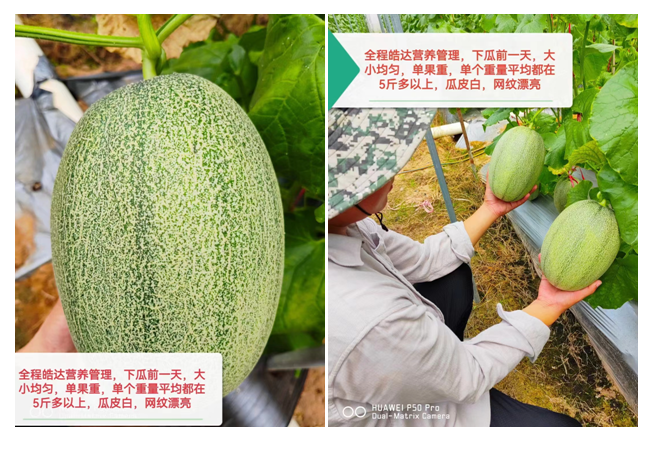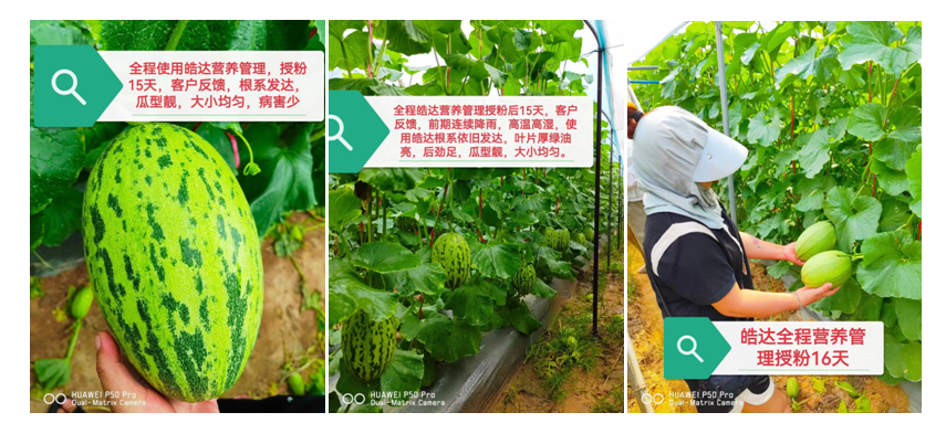 李大姐表示,用了皓達產品后,原先打兩遍農藥的錢都用來買了皓達,成本大大降低了,畢竟打一遍農藥的錢比買一桶皓達花費更多。哈密瓜施用皓達后,整體植株長勢更好,后期因為瓜健康,霜霉病之類的病都會少得,又再次節省了農藥和肥料的花費。用(淋噴)兩遍皓達,哈密瓜大小均勻,瓜皮漂亮,上網紋快。李大姐由衷表示皓達產品技術真的高,效果意想不到的好。