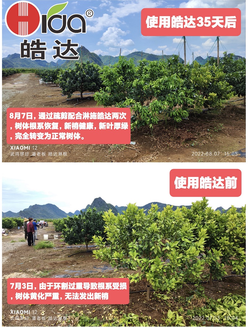 我們在廣西、廣東、贛州、湖北、黑龍江、內蒙等多地的多種果樹上進行了大量大田示范,通過應用皓達微生物次生代謝物,果樹可在短時間內快速恢復生長,表現為根系快速生長,白根毛根面積快速擴大,吸收營養能力增強,果樹的葉片快速轉綠增厚,果樹的抗逆性明顯提高,病蟲害的發生也明顯減少。此外,該技術還可以改善果實的品質,讓果實膨大快,果皮細膩,水份充足,香甜可口,轉色快,果色正,提高了果實的商品價值。這一技術在果樹恢復方面的應用,將為果樹產業的發展帶來新的機遇和挑戰。