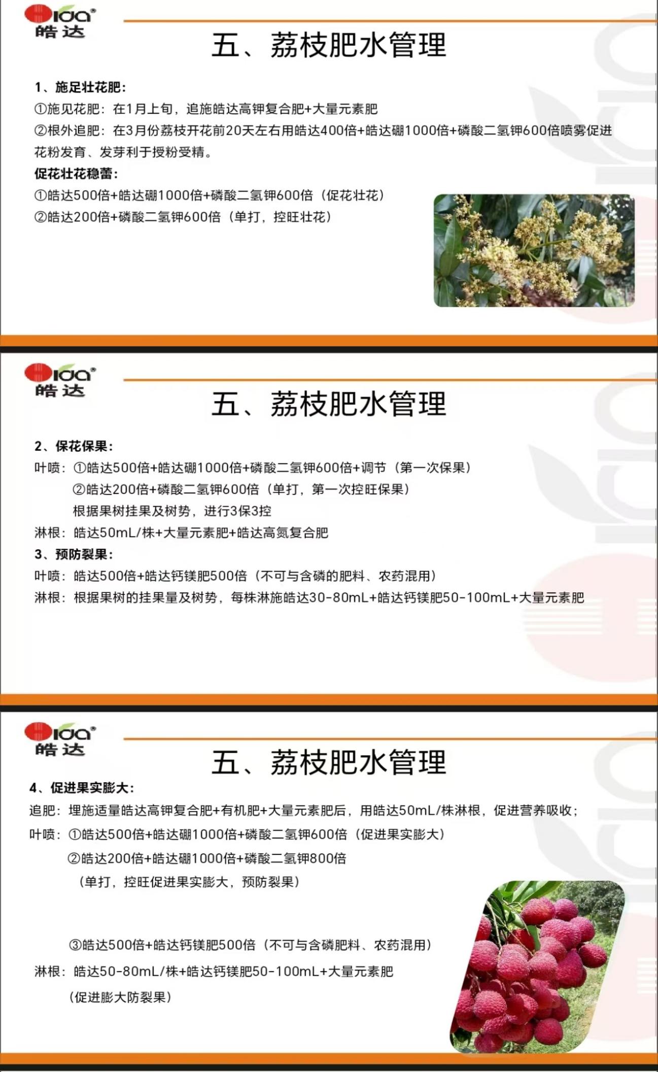 梁老師建議,荔枝花芽萌動初期噴施皓達800倍液促進花芽分化,待花芽顯露后改用皓達200倍液進行營養調控。該方案通過調節樹體內源激素平衡,可延緩花芽分化速度,避免因集中開花導致的“爆花”現象,從而提升授粉質量與坐果率。