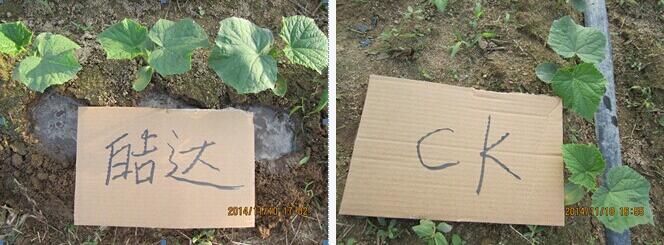 2014年11月20觀察:施用“皓達(dá)有機(jī)水溶肥”的青瓜苗葉片厚綠、寬大。對照葉片小、發(fā)黃。