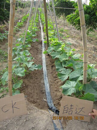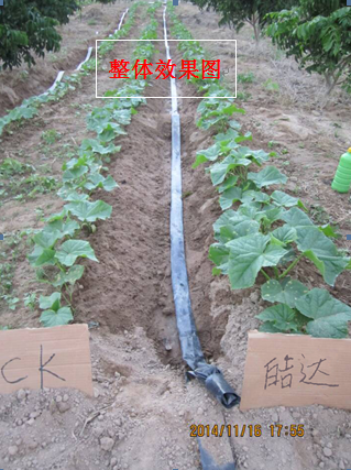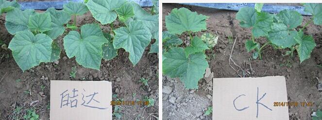 2014年11月16日觀察:該青瓜地出現(xiàn)病害,施用“皓達(dá)有機(jī)水溶肥”的青瓜苗長勢旺盛,受病害的影響較小;對照的影響較大。