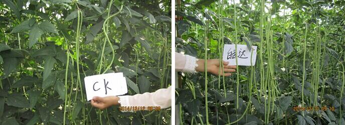 三亞市崖城鎮(zhèn)黎師傅家,從2014年11月28日至2014年12月9日期間共用“皓達(dá)有機(jī)水溶肥”淋根兩次。2014年12月12日觀察,對照的豇豆結(jié)果率低,施用“皓達(dá)有機(jī)水溶肥”的豇豆結(jié)果率高,豇豆又直又長,賣相好。