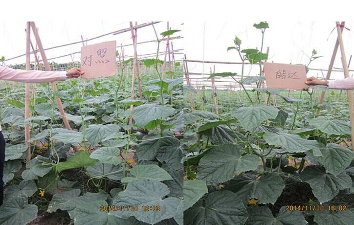 2014年11月25日、11月30日連續(xù)兩次葉面噴施“皓達(dá)有機(jī)水溶肥”后,青瓜長勢健壯,莖稈粗、葉片綠大、花芽分化明顯。對照整體偏瘦弱。上圖為11月30日觀察的效果。