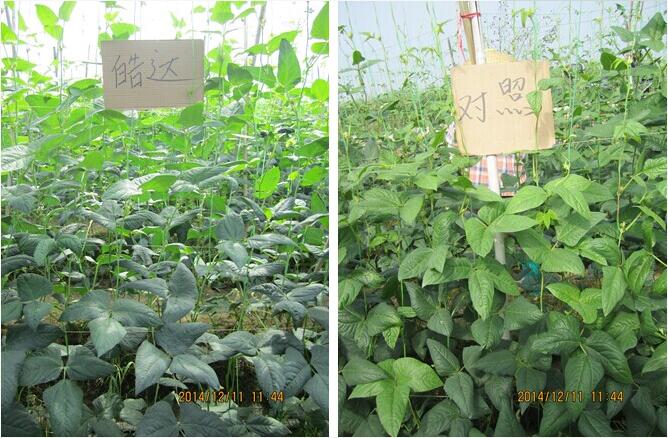2014年12月7日,三亞市南濱農(nóng)場十一連劉師傅家,“皓達(dá)有機(jī)水溶肥”稀釋1000倍葉面噴施,2014年12月11日觀察,豇豆整體長勢好,光合作用旺盛,葉片厚綠、植株健壯;對照莖稈纖細(xì)、葉片發(fā)黃。