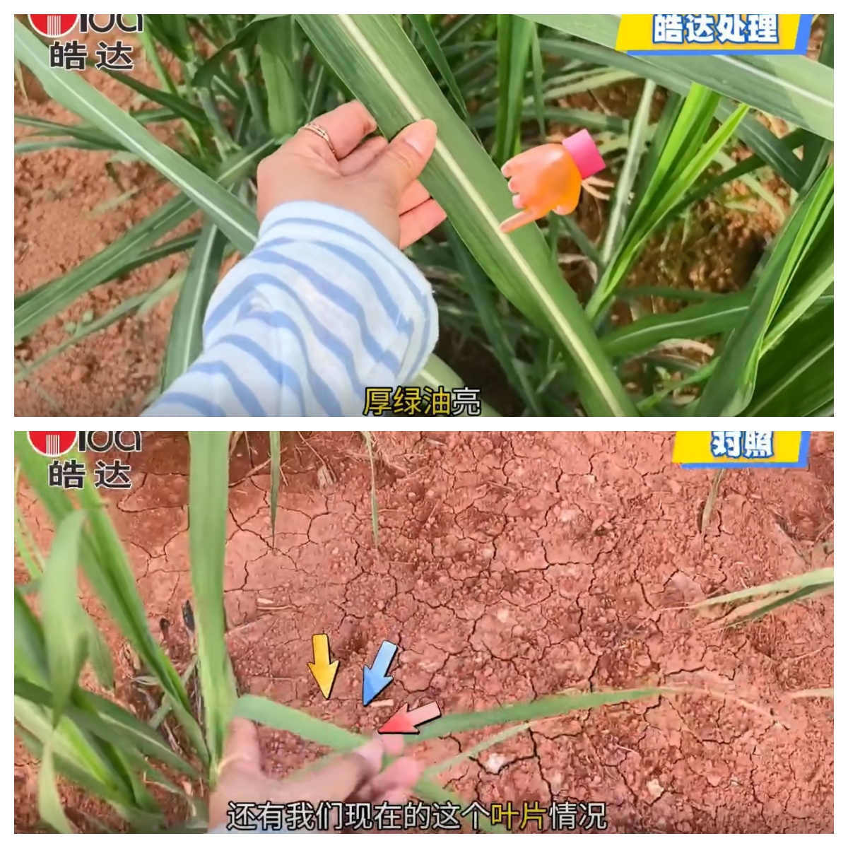 3.皓達處理的甘蔗長勢高大、茂盛;對照的甘蔗長勢弱小、稀疏。