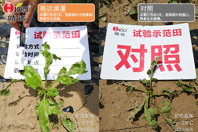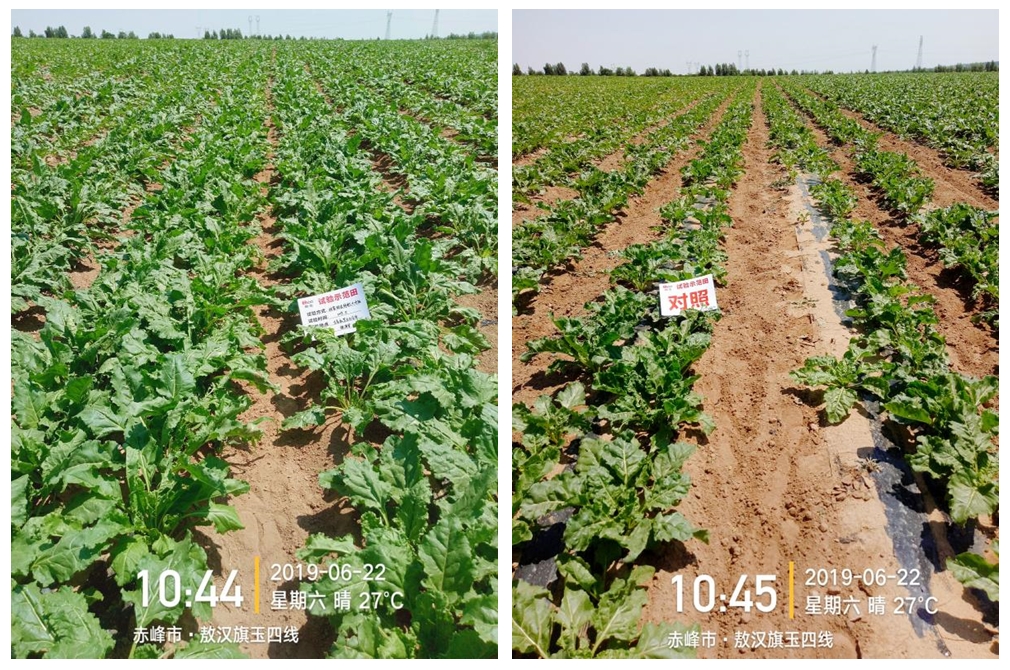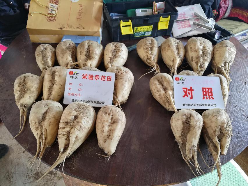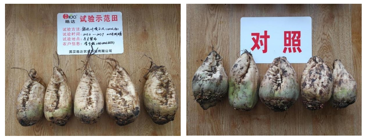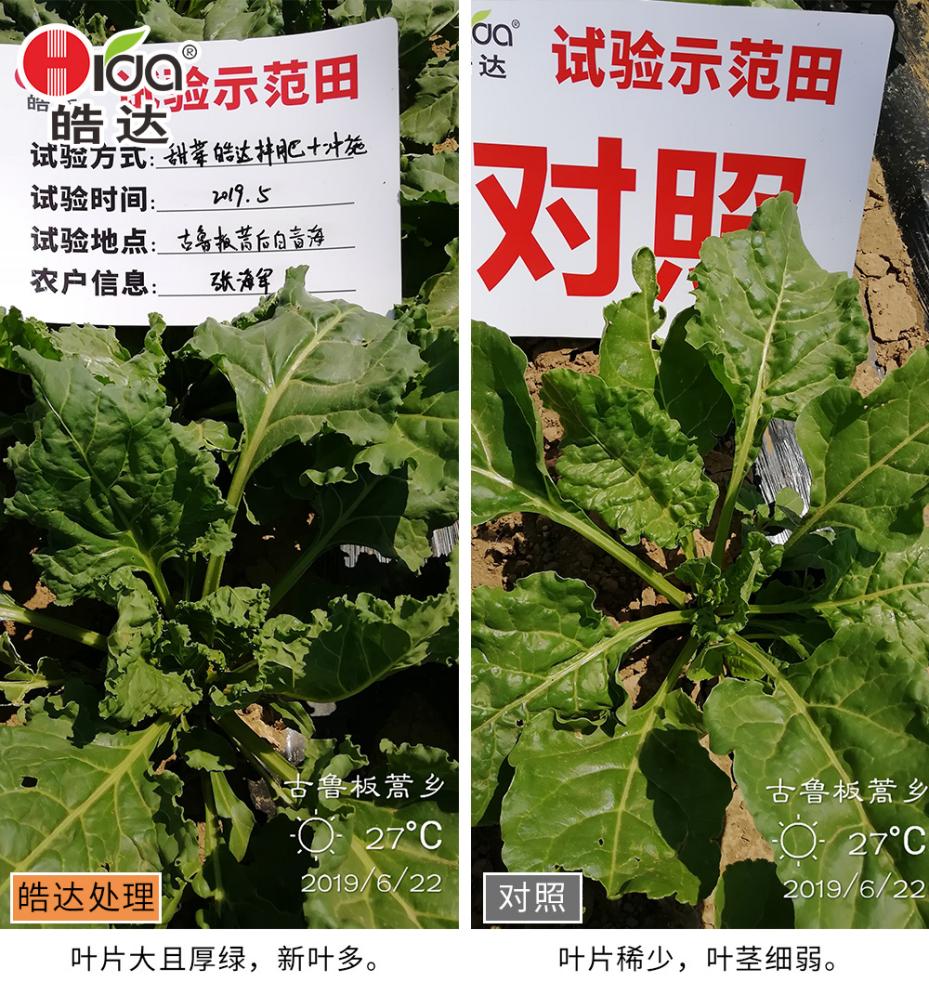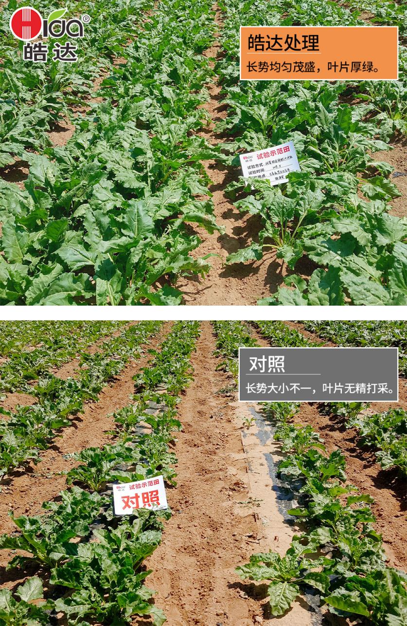施肥時期:塊根膨大期 施肥方案: 滴灌:皓達功能肥200mL/畝+皓達鈣鎂肥100mL/畝(隨大肥) 葉噴:皓達功能肥1000倍(50mL/畝)+皓達鈣鎂肥500倍(50mL/畝) 施肥效果: 保持葉片功能性,加快光合產物向根部轉運積累,促進塊根膨大。可明顯增加垂度值,增產提糖。