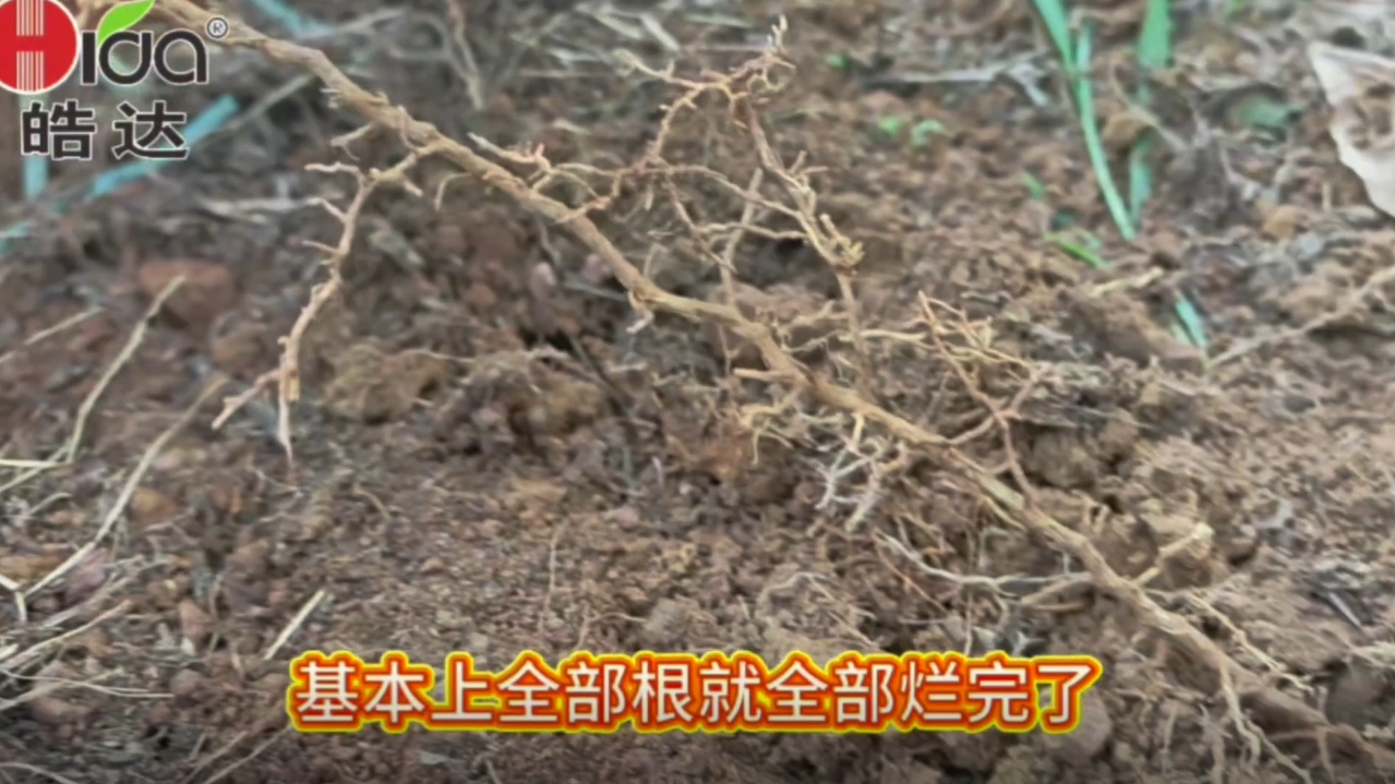 砂糖橘果樹葉片發黃,通過調研發現主要是根系出了問題,根系發黑壞死,樹體得不到正常的營養供給。